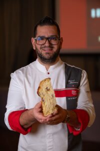 Manuel Maiorano patron e fondatore della pizzeria La Fenice e del nuovissimo Crunch sempre a Pistoia porterà una creazione gastronomica, salata. Manuel presente fin dalla prima edizione della manifestazione, continua a stupire con la sua versione salata del lievitato natalizio, stavolta arricchita da Marroni del Mugello IGP nell’impasto, ma anche pancetta di cinta senese e scaglie di formaggio pecorino Metello della Garfagnana, prodotto dall’azienda Busti a Metello (Lucca) piccolo borgo quasi a 1.000 metri di altitudine.